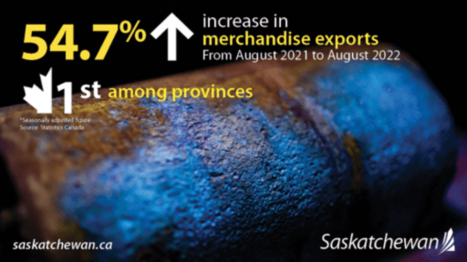 Saskatchewan's economy remains strong, with Statistics Canada reporting today that merchandise exports increased by 54.7 per cent in August 2022 compared to August 2021, ranking first among the provinces.