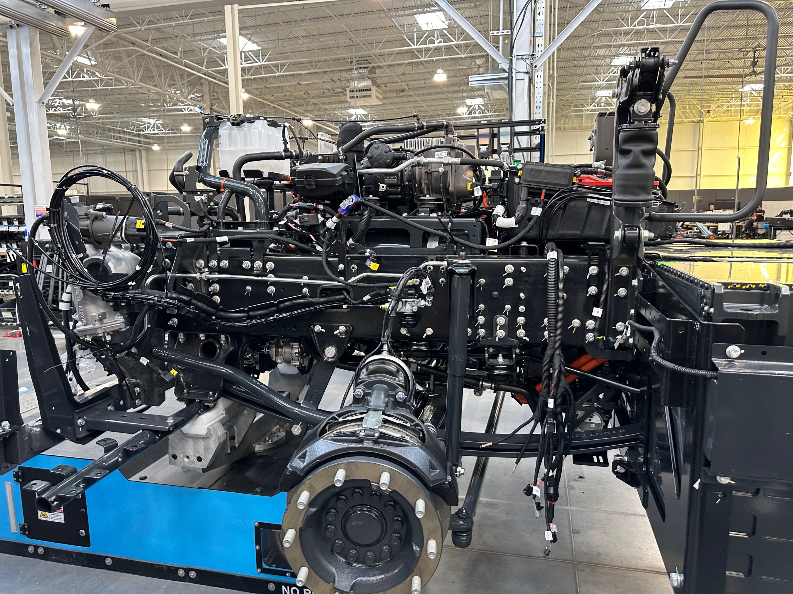 We were treated to a full tour of the facility, which included fifteen building stations where each part was added on to the vehicle in a production line, the chassis dynamometer, and the test track. While moving through the production line, we saw the electric motor used in their battery electric model, which has the horsepower of 10 Teslas. Similarly, we saw the battery units Nikola makes in house, with each truck being equipped with nine 1,100 batteries each. Additionally, Nikola’s engineering team provided an up-close view and explanation of the hydrogen fuel cells currently in production.